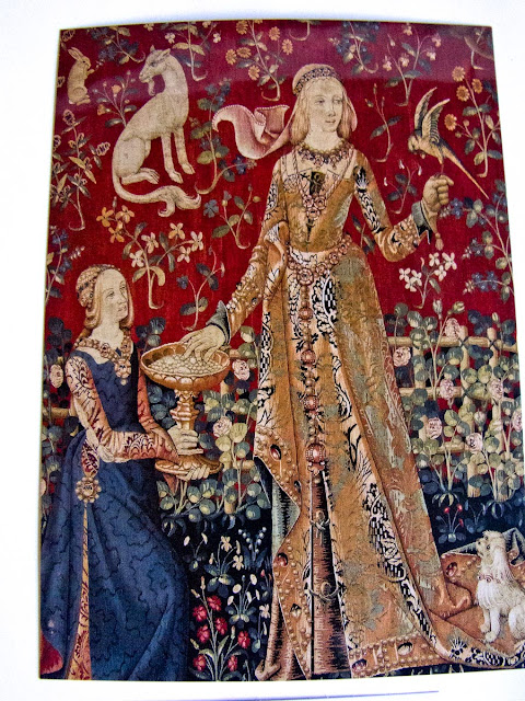 六枚が同じ大きさではありませんでしたが ただそれぞれの微妙に違う色合いのなんと美しいことでしょうか。いったいどのくらいの時間をかけて何人の職人の手になり織り上げられたのか気が遠くなります。タピスリーの謎解きをする前に無条件で此の美しさを楽しみました。