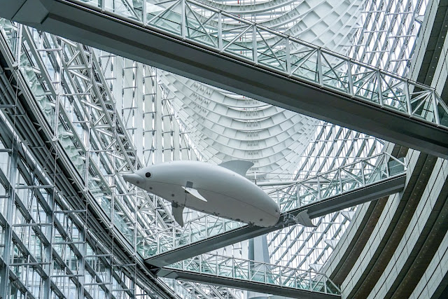イルカがゆっくり旋回していました... 細いひも付きです。「どうして動いているの」「あそこのリモコン」変わったものを見ると興奮しやすい質です。尾びれを操作することで自在に動くようです。「名前は?」「今募集中書いていってください」